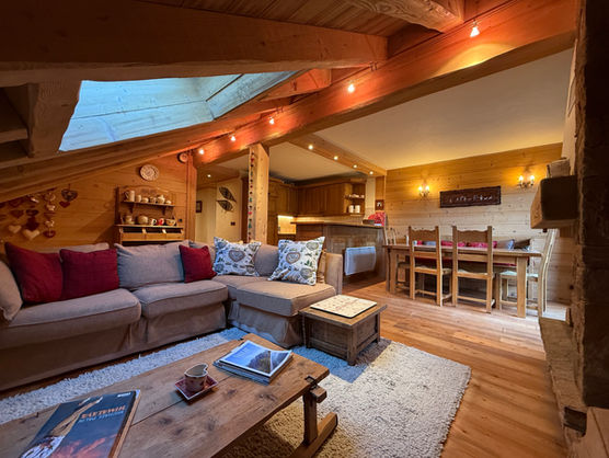 The living space is open plan, centred around a wood burner for cosy evenings around the fire. A spacious kitchen with a bar looks over the dining area with space for eight and a sunny balcony with views of the mountains.